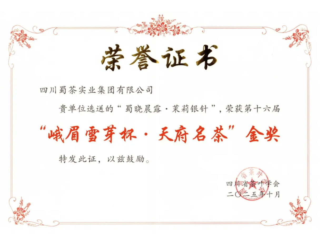 近日,由四川省茶葉學會主辦,四川省園藝作物技術推廣總站、四川省農業科學院茶葉研究所、四川農業大學聯合支持的第十六屆“峨眉雪芽杯?天府名茶” 評選活動圓滿落幕,蜀茶集團選送產品“蜀曉晨露·茉莉銀針”榮獲“峨眉雪芽杯?天府名茶” 金獎。